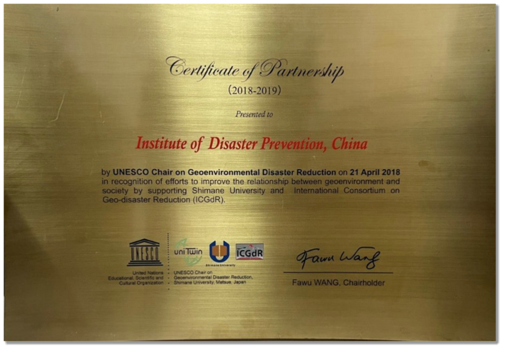 联合国教科文组织地质环境灾害减灾教席项目国际协作单位证书