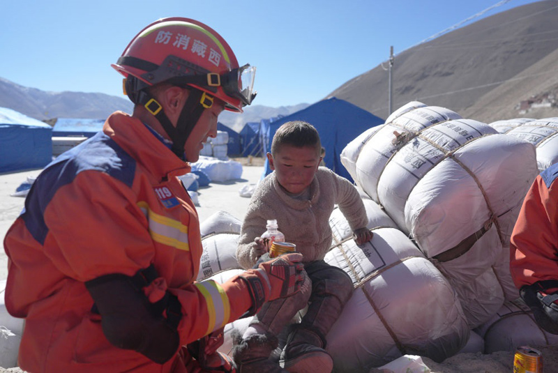 2025年1月8日,在西藏定日县措果乡塘仁村安置点,消防救援人员和小朋友互动。1月7日,西藏日喀则市定日县发生6.8级地震。(新华社记者 晋美多吉/摄)