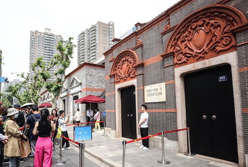 2025年5月1日,游人在位于上海的中共一大会址前留影。(新华社记者 刘颖/摄)