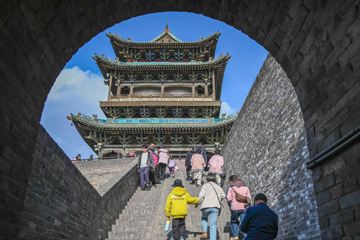 游客登上山西省晋中市平遥古城城墙游览观光(2025年4月4日摄)。(新华社发 梁生仁/摄)