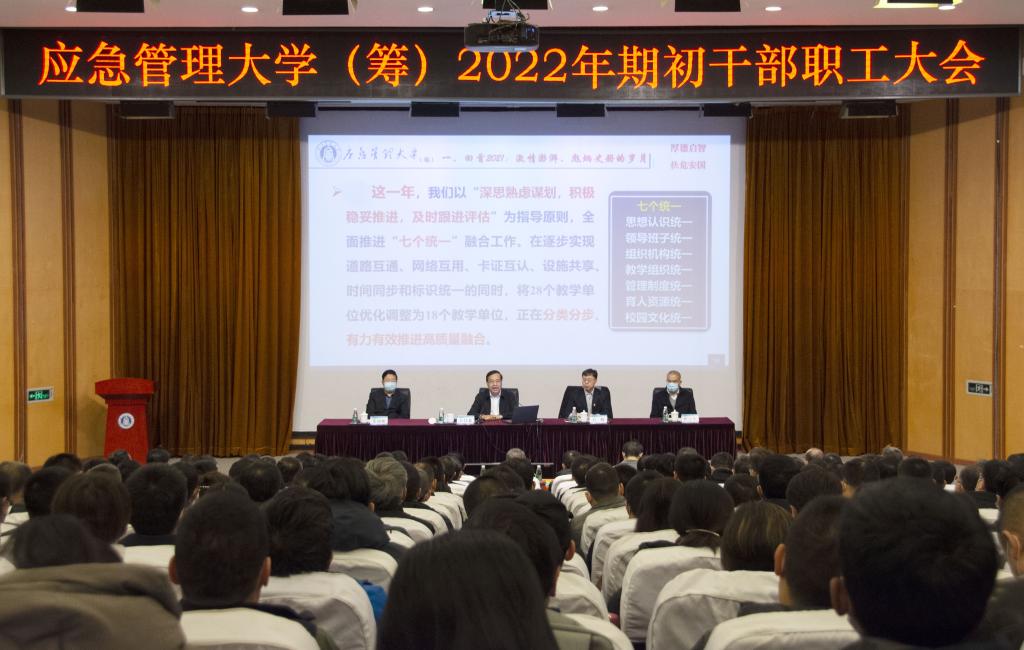 卜昌森强调,一年之计在于春。在春回大地、万物复苏的美好时节,在新学期伊始、推进大学筹建的关键时候,召开干部职工大会,目的是吹响冲锋号,发起总动员,弘扬“拓荒牛”精神,激发“下山虎”气势,坚决打赢去筹挂牌攻坚战,全力开创应急管理大学新纪元,以优异成绩向党的二十大献礼。卜昌森系统回顾了一年来的筹建工作,归纳了“六个至关重要”:高度的政治站位至关重要、坚强的组织领导至关重要、完善的工作机制至关重要、过硬的工作作风至关重要、果敢的超常举措至关重要、充分的借势借力至关重要,全面总结了筹建工作宝贵经验;阐述了“六个难以忘怀”:难以忘怀部党委高度重视、难以忘怀领导班子勠力同心、难以忘怀干部队伍担当拼搏、难以忘怀广大师生众志成城、难以忘怀离退干部发光发热、难以忘怀社会各界鼎力支持,高度评价了各方面的工作,表达了最真诚的感谢。